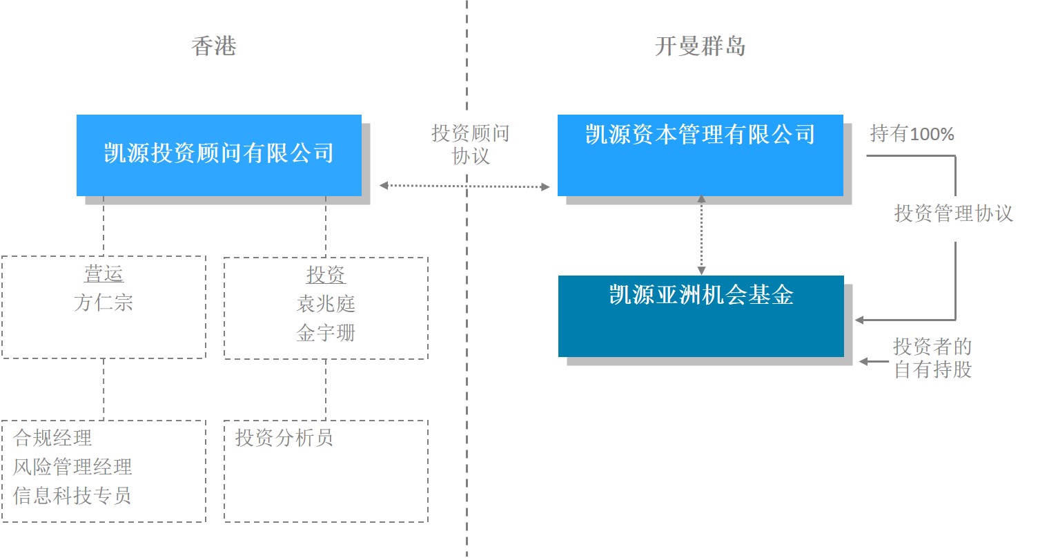 基金注册并设立于开曼群岛,由凯æºèµ„æœ¬ç®¡ç†æœ‰é™å…¬å¸ç®¡ç†, 并由香港的凯æºèµ„æœ¬ç®¡ç†æœ‰é™å…¬å¸(ZCA)æä¾›é¡¾é—®æœåŠ¡ã€‚ 所有å—规管行为å‡ç”±é¦™æ¸¯è¯ç›‘会å‘牌机构(9å·èµ„产管ç†ç‰Œç…§)ZCA进行。 è¢å…†åºå…ˆç”Ÿå’Œé‡‘宇çŠå°å§æ˜¯ZCA的管ç†äººå‘˜ï¼Œè´Ÿè´£åŸºé‡‘çš„è¿è¥åŠæŠ•èµ„,æ–¹ä»å®—先生为ZCA的首å¸è¥è¿æ€»ç›‘。